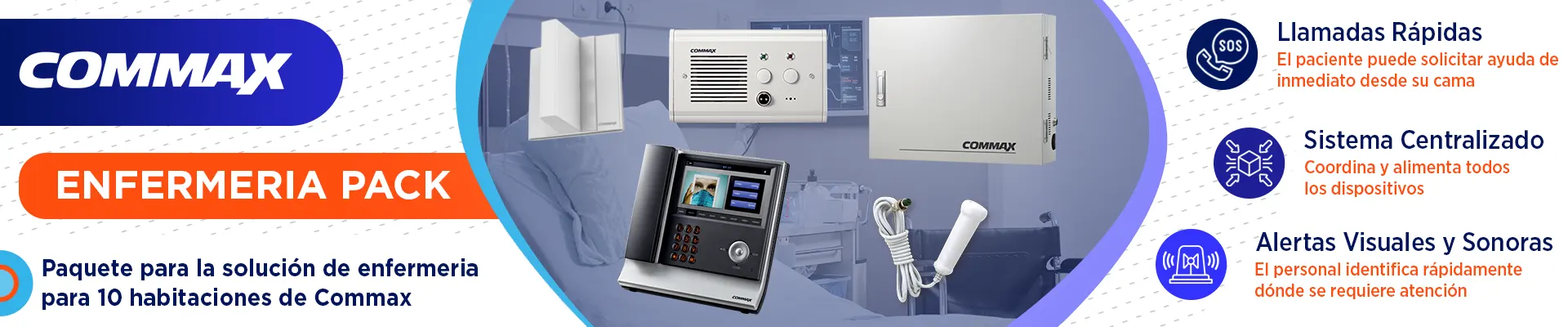 Este paquete del sistema de llamado de enfermería Commax ofrece una solución completa para la atención hospitalaria, permitiendo una comunicación eficiente entre pacientes y personal médico. Incluye una unidad central que alimenta y coordina todos los dispositivos, una unidad de intercomunicación para gestionar los llamados, diez subestaciones de cama con pulsadores para que el paciente solicite asistencia, y dos luces de corredor que indican visualmente las alertas en cada habitación. Es un sistema integral diseñado para mejorar la respuesta del personal y optimizar el flujo de atención en el área hospitalaria.